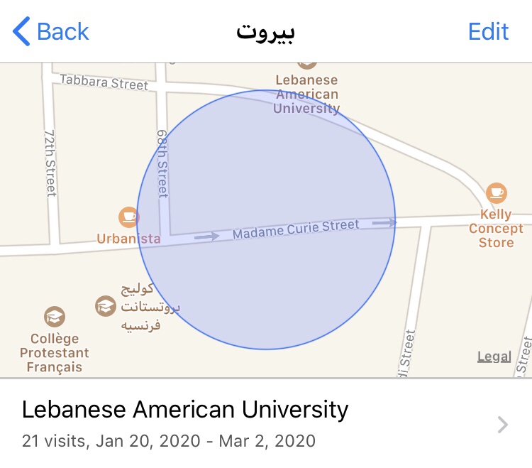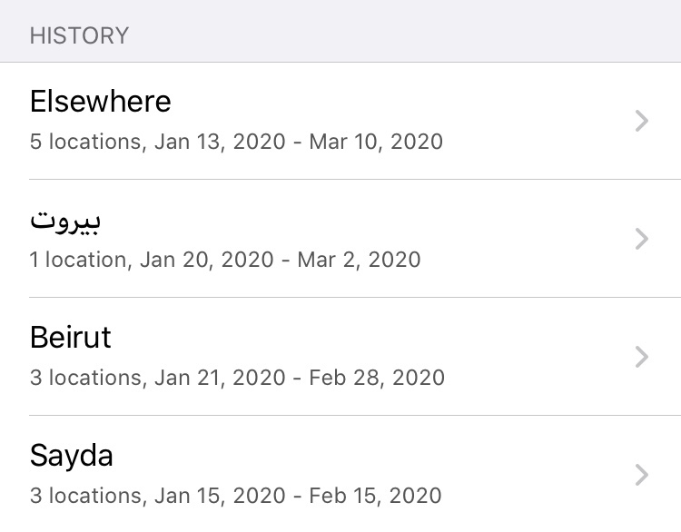 The photo of the location history shown 3 places I go to (Beirut, Saida, elsewhere).